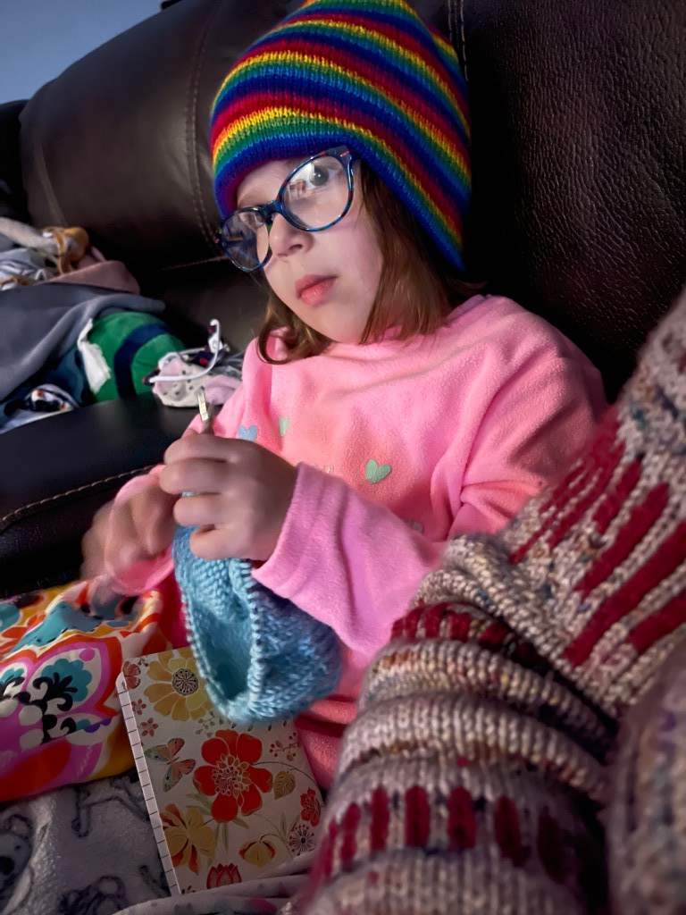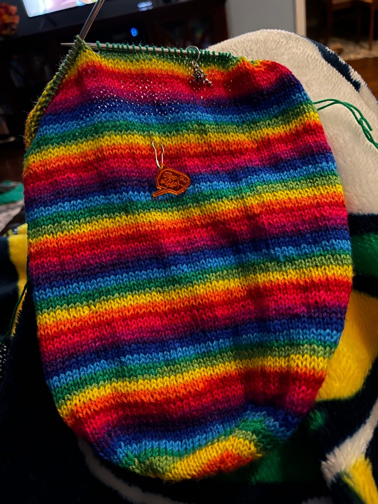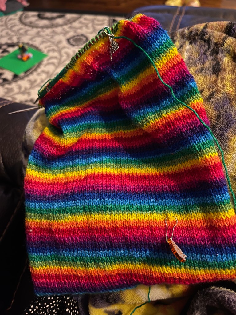 Musselburgh – Z hat Project Details: Start: 11/13/2021Finished: 11/19/2021Pattern: Musselburgh by YsoldaYarn: Unknown Rainbow Sock Yarn from stashEstimated 400yd/100gUSED: 62 g = 248 ydNeedles: US 3Size: Child/Adult Small Related